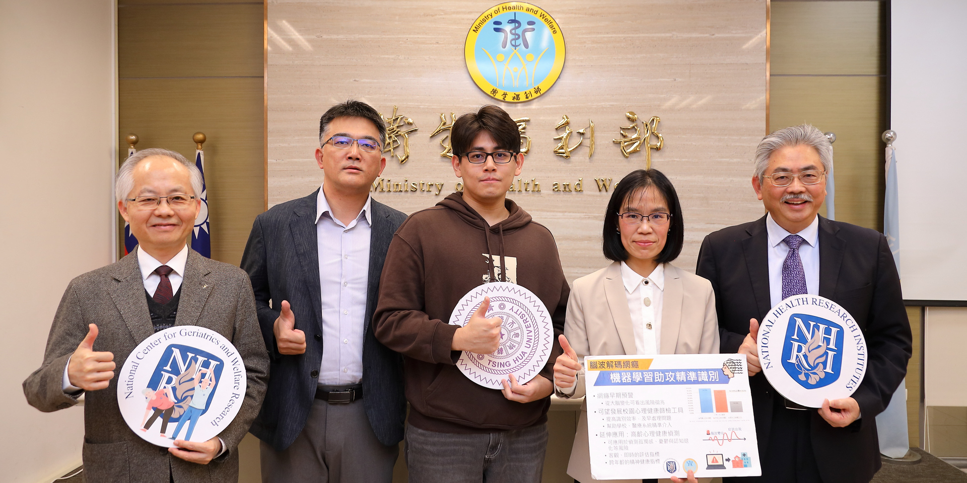 ▲研究發表合影(左起:國衛院高齡研究中心許志成執行長、清華大學工科系吳順吉教授、清華大學生物影像與奈米診療學程碩士李柏禹、國衛院高齡研究中心黃緒文助研究員、國衛院陳為堅副院長)。